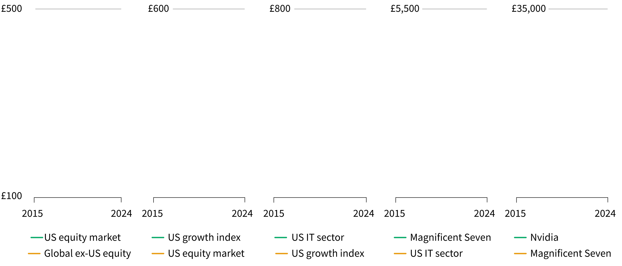 The outperformance of US equities in recent years might lead some investors to question the case for a globally diversified portfolio. After all, a £100 investment in US equities 10 years ago would have grown to £402 by the end of 2024 (an annualised 15% return) - more than twice the final balance of £193 (an annualised 7% return) for an equivalent investment in global ex-US equities .
